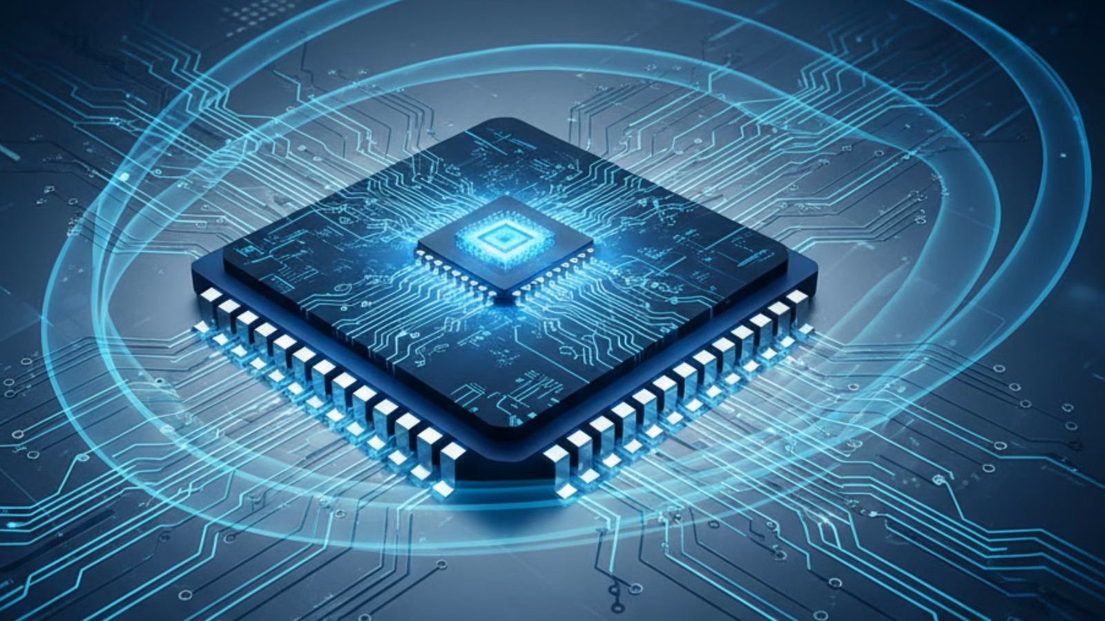 Illustration of an advanced microchip with visualized magnetic fields, representing MIT's breakthrough in magnetic semiconductor transistors for next-generation electronics.